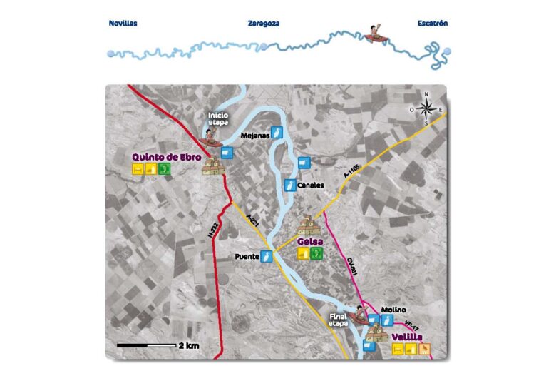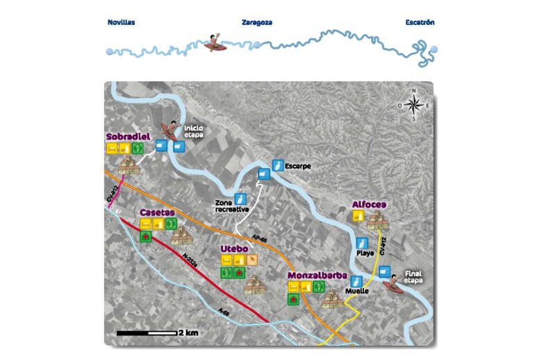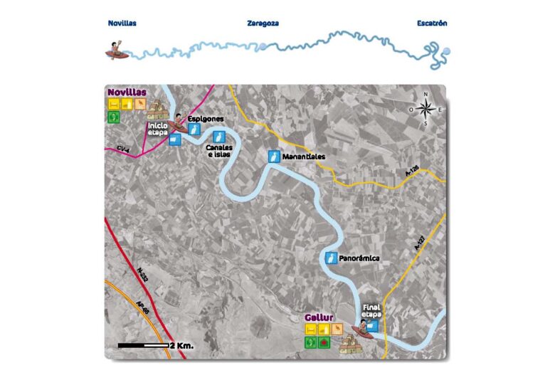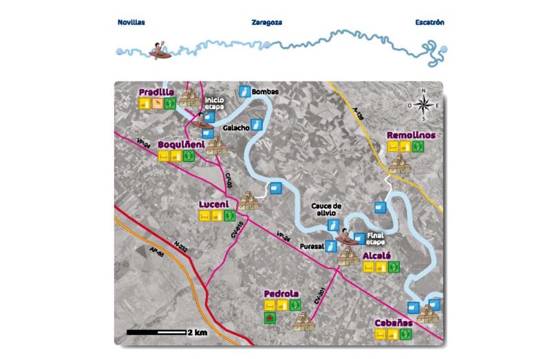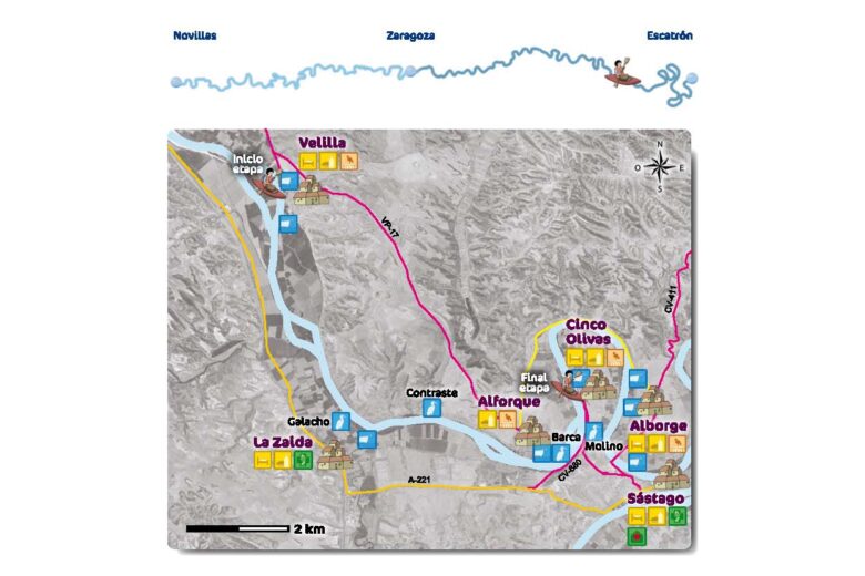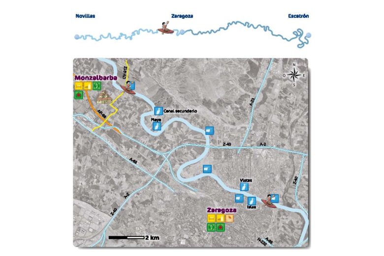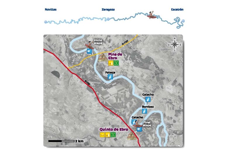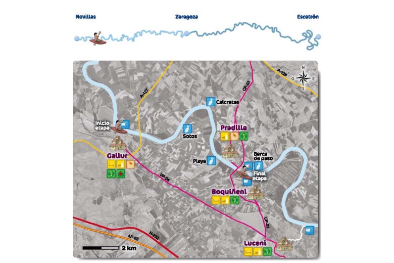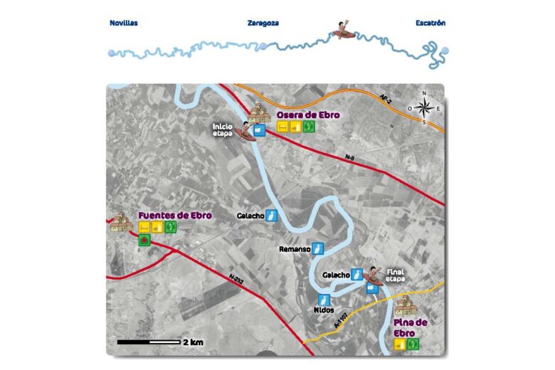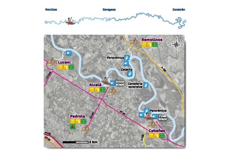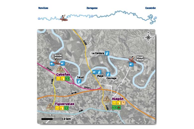 En la orilla derecha del Ebro, junto al albergue de Escatrón (126 m), se sigue por el parque fluvial. Se…