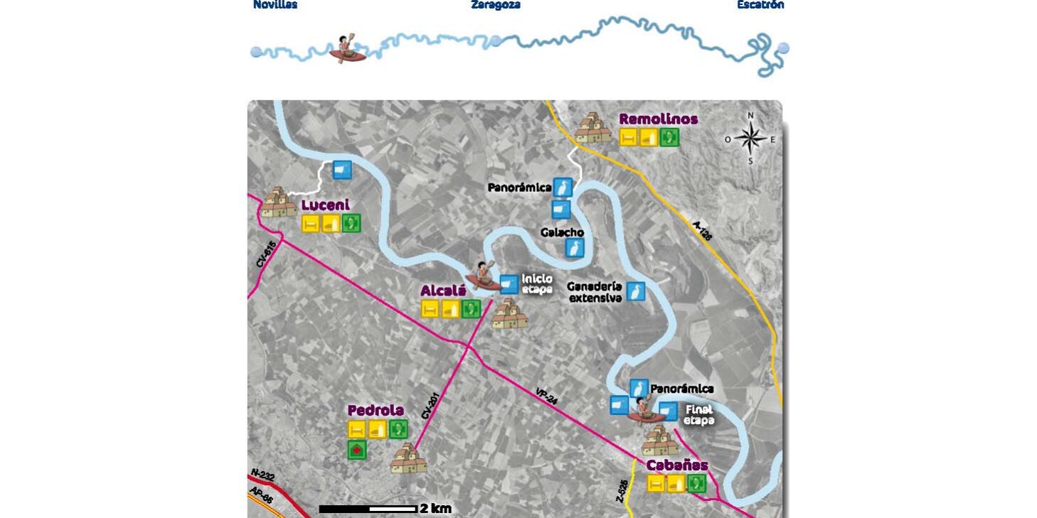 Prepárate para navegar en uno de los tramos más tortuosos de la Ribera Alta del Ebro. Los 3,5 kilómetros que separan las poblaciones de Alcalá y Cabañas por carretera, el Ebro los convierte en 10 kilómetros de paseo fluvial de meandros o “revueltas” de río.
